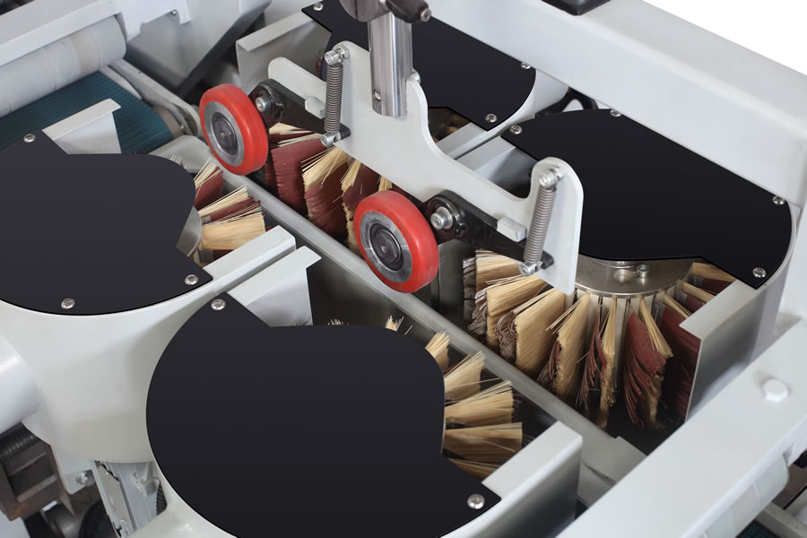 此設備帶自動進料系統,三個面同時打磨,大大提高生產效率。 適用于各種實木、密度板、貼皮板等等直線型(如門邊線、踢腳線、相框等等)、L型的木線和長條木板的規則面、異形面、平面和曲面的白坯、油漆的打磨、拋光等。
